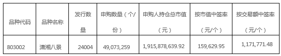 本次申购品种采用按持仓市值申购和交易额申购,其中供申购数量的12002个按持仓市值分配,12002个按交易额分配。请广大参与申购的投资人会员关注交易账号中持仓数量和资金变化情况。《潇湘八景》已于2016年11月16日正式挂牌交易。