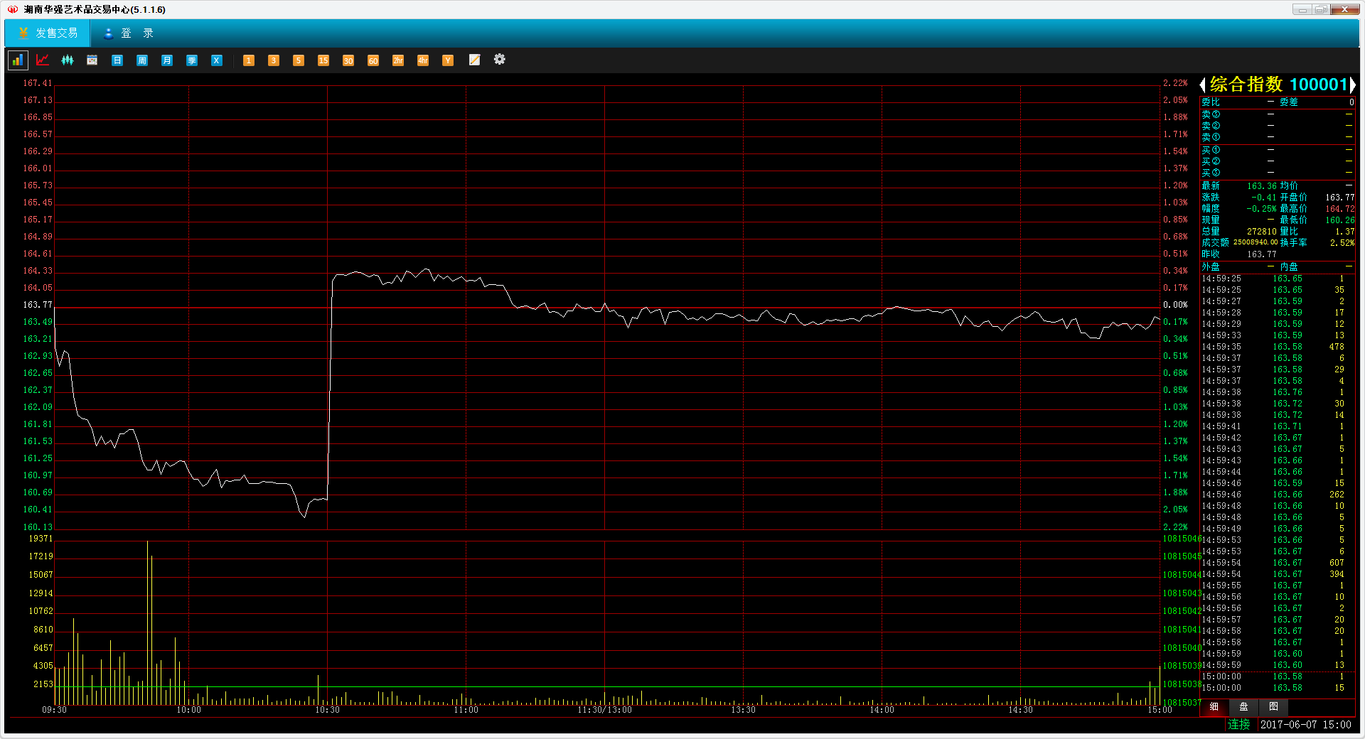 今日市场走出窄幅震荡的行情。综合指数收于163.36点,跌0.25%,成交0.25亿元。艺术品指数收于26.20点,跌3.60%。收藏品指数收于185.60点,涨0.87%。全市有8家上涨(4家涨停),有41家下跌(13家跌停)。